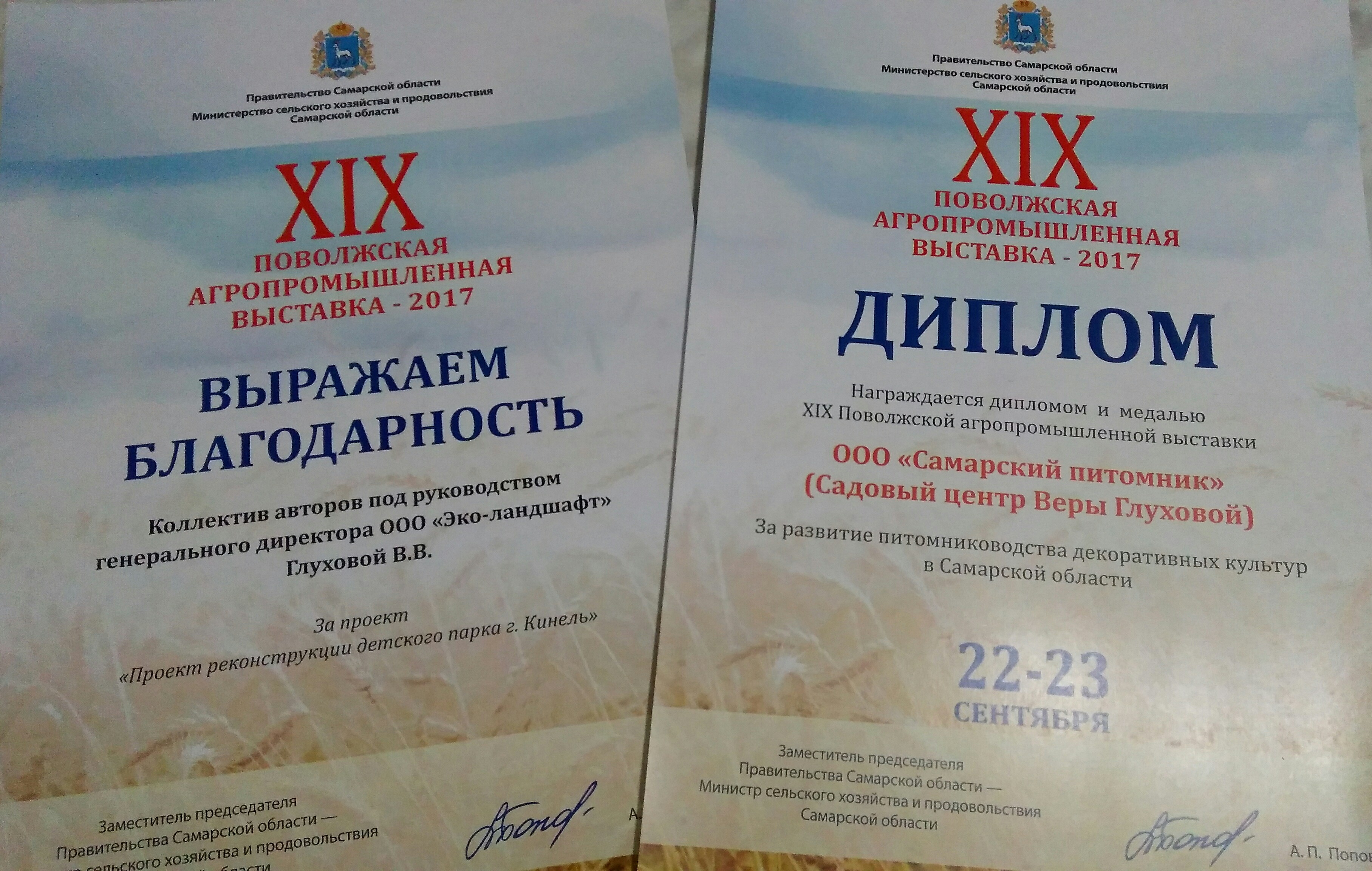 23 сентября завершилась ХlХ Поволжская агропромышленная выставка. Садовый центр Веры Глуховой был отмечен золотой медалью и дипломом за развитие питомниководства декоративных культур в Самарской области, а также получил благодарность за проект реконструкции детского парка г.Кинель .